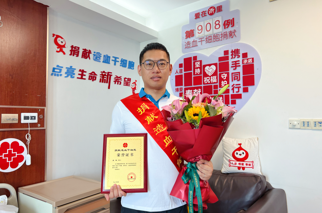 今天上午,临平区第33例造血干细胞捐献者,27岁的小伙子庞军在省中医院造血干细胞采集室完成捐献。