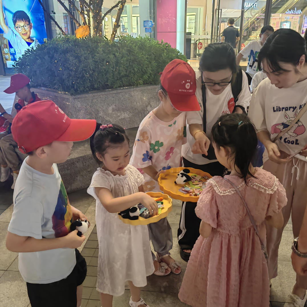 红十字小志愿者们在家长们的带领下,摆出了琳琅满目的商品。夜幕降临,活动现场已是人头攒动,小志愿者们稚嫩的吆喝声此起彼伏,点燃了活动现场的热情。他们带着商品,走出摊位进行售卖,见到前来咨询的顾客便十分热情地向大家推销。对于义卖的商品,小志愿者们也是动足了心思,不仅有精心挑选的各类绘本读物、玩具零食、手工制作的发卡,也有小朋友创意十足,布置了一个毛绒玩具套圈小摊,吸引不少市民驻足参与。